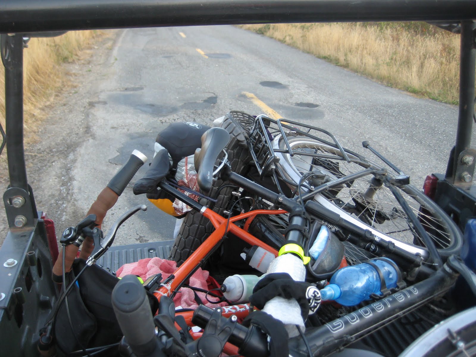 After about 15 minutes, Chris mentioned Christine, and said, hopefully nothing has happened to her. Ross pointed at a car that was approaching and said, that they would probably have seen her and would tell us if something had happened. The car stopped. It was a red pickup. And inside was Christine, and her bike on the back of the pickup. Her breaks had given up as well, but everything was fine. She had hitchhiked down the hill. This hill was the famous 'wall', which now became obvious when looking back.
